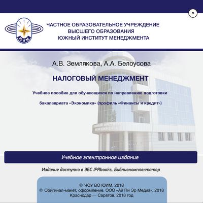 Землякова А.В. Налоговый менеджмент : учебное пособие для обучающихся по направлению подготовки бакалавриата «Экономика», профиль «Финансы и кредит» / Землякова А.В., Белоусова А.А.. — Краснодар, Саратов : Южный институт менеджмента, Ай Пи Эр Медиа, 2018. — 40 c. — Текст : электронный // Цифровой образовательный ресурс IPR SMART : [сайт]. — URL: https://www.iprbookshop.ru/75086.html (дата обращения: 06.12.2025). — Режим доступа: для авторизир. пользователей