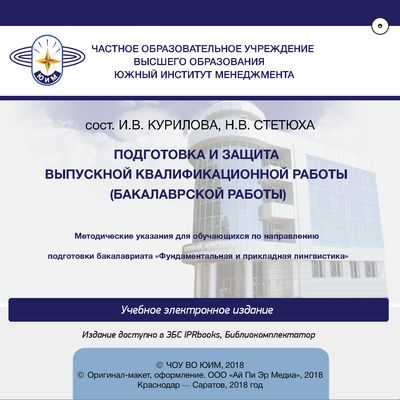 Подготовка и защита выпускной квалификационной работы (бакалаврской работы) : методические указания для студентов, обучающихся по направлению подготовки «Фундаментальная и прикладная лингвистика» / . — Краснодар, Саратов : Южный институт менеджмента, Ай Пи Эр Медиа, 2018. — 64 c. — Текст : электронный // Цифровой образовательный ресурс IPR SMART : [сайт]. — URL: https://www.iprbookshop.ru/75089.html (дата обращения: 15.12.2025). — Режим доступа: для авторизир. пользователей