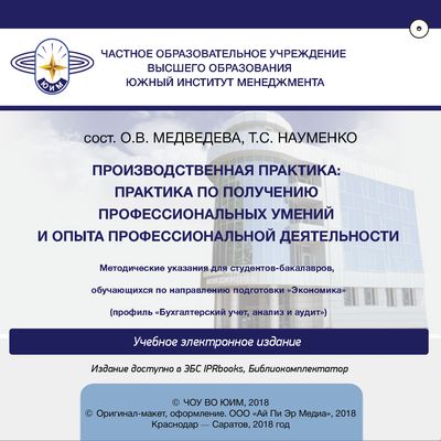 Производственная практика: практика по получению профессиональных умений и опыта профессиональной деятельности : методические указания для студентов-бакалавров, обучающихся по направлению подготовки «Экономика», профиль «Бухгалтерский учет, анализ и аудит» / . — Краснодар, Саратов : Южный институт менеджмента, Ай Пи Эр Медиа, 2018. — 47 c. — Текст : электронный // Цифровой образовательный ресурс IPR SMART : [сайт]. — URL: https://www.iprbookshop.ru/75090.html (дата обращения: 05.12.2025). — Режим доступа: для авторизир. пользователей