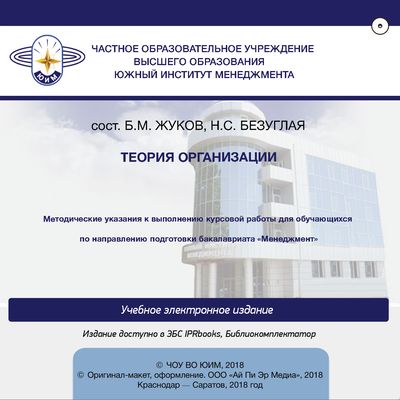 Теория организации : методические указания к выполнению курсовой работы для обучающихся по направлению подготовки бакалавриата «Менеджмент» / . — Краснодар, Саратов : Южный институт менеджмента, Ай Пи Эр Медиа, 2018. — 24 c. — Текст : электронный // Цифровой образовательный ресурс IPR SMART : [сайт]. — URL: https://www.iprbookshop.ru/77963.html (дата обращения: 05.12.2025). — Режим доступа: для авторизир. пользователей