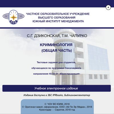 Дзиконская С.Г. Криминология (общая часть) : тестовые задания для студентов, обучающихся по программе бакалавриата направления 40.03.01 «Юриспруденция» / Дзиконская С.Г., Чапурко Т.М.. — Краснодар, Саратов : Южный институт менеджмента, Ай Пи Эр Медиа, 2018. — 49 c. — Текст : электронный // Цифровой образовательный ресурс IPR SMART : [сайт]. — URL: https://www.iprbookshop.ru/78033.html (дата обращения: 05.12.2025). — Режим доступа: для авторизир. пользователей