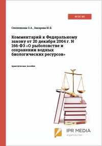 Слепенкова, О. А. Комментарий к Федеральному закону от 20 декабря 2004 г. N 166-ФЗ «О рыболовстве и сохранении водных биологических ресурсов» / О. А. Слепенкова, Ю. Б. Захарова ; под редакцией И. В. Шопен. — 3-е изд. — Саратов : Ай Пи Эр Медиа, 2019. — 240 c. — ISBN 978-5-4486-0625-0. — Текст : электронный // Цифровой образовательный ресурс IPR SMART : [сайт]. — URL: https://www.iprbookshop.ru/80349.html (дата обращения: 27.06.2024). — Режим доступа: для авторизир. пользователей