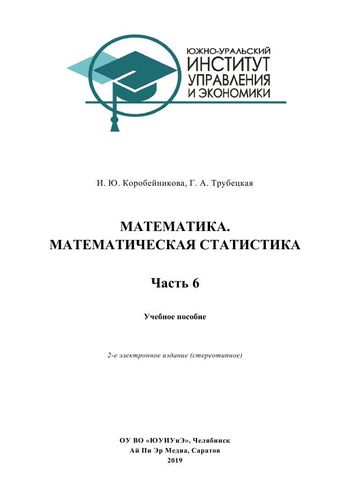 Коробейникова, И. Ю. Математика. Математическая статистика. Ч. 6 : учебное пособие / И. Ю. Коробейникова, Г. А. Трубецкая. — 2-е изд. — Челябинск, Саратов : Южно-Уральский институт управления и экономики, Ай Пи Эр Медиа, 2019. — 82 c. — ISBN 978-5-4486-0661-8. — Текст : электронный // Цифровой образовательный ресурс IPR SMART : [сайт]. — URL: https://www.iprbookshop.ru/81484.html (дата обращения: 02.07.2024). — Режим доступа: для авторизир. пользователей