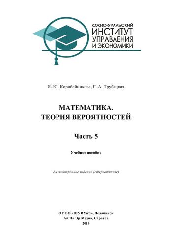 Коробейникова, И. Ю. Математика. Теория вероятностей. Ч. 5 : учебное пособие / И. Ю. Коробейникова, Г. А. Трубецкая. — 2-е изд. — Челябинск, Саратов : Южно-Уральский институт управления и экономики, Ай Пи Эр Медиа, 2019. — 154 c. — ISBN 978-5-4486-0662-5. — Текст : электронный // Цифровой образовательный ресурс IPR SMART : [сайт]. — URL: https://www.iprbookshop.ru/81485.html (дата обращения: 02.07.2024). — Режим доступа: для авторизир. пользователей
