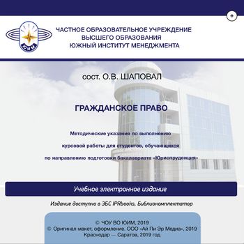 Гражданское право : методические указания по выполнению курсовой работы для студентов, обучающихся по направлению подготовки бакалавриата «Юриспруденция» / . — Краснодар, Саратов : Южный институт менеджмента, Ай Пи Эр Медиа, 2019. — 40 c. — Текст : электронный // Цифровой образовательный ресурс IPR SMART : [сайт]. — URL: https://www.iprbookshop.ru/81855.html (дата обращения: 14.12.2025). — Режим доступа: для авторизир. пользователей