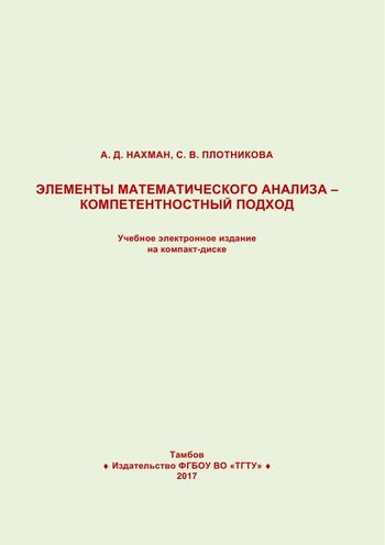 Нахман, А. Д. Элементы математического анализа - компетентностный подход : учебное пособие / А. Д. Нахман, С. В. Плотникова. — Тамбов : Тамбовский государственный технический университет, ЭБС АСВ, 2017. — 81 c. — ISBN 978-5-8265-1708-6. — Текст : электронный // Цифровой образовательный ресурс IPR SMART : [сайт]. — URL: https://www.iprbookshop.ru/85985.html (дата обращения: 07.07.2023). — Режим доступа: для авторизир. пользователей
