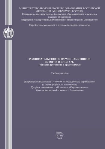 Законодательство по охране памятников истории и культуры (объекты археологии и архитектуры) : учебное пособие / . — Пермь : Пермский государственный гуманитарно-педагогический университет, 2018. — 149 c. — ISBN 978-5-85218-992-9. — Текст : электронный // Цифровой образовательный ресурс IPR SMART : [сайт]. — URL: https://www.iprbookshop.ru/86347.html (дата обращения: 06.12.2025). — Режим доступа: для авторизир. пользователей