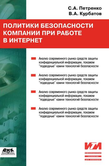 Петренко, С. А. Политики безопасности компании при работе в Интернет / С. А. Петренко, В. А. Курбатов. — 3-е изд. — Москва : ДМК Пресс, 2018. — 396 c. — ISBN 978-5-93700-057-6. — Текст : электронный // Цифровой образовательный ресурс IPR SMART : [сайт]. — URL: https://www.iprbookshop.ru/89596.html (дата обращения: 28.05.2024). — Режим доступа: для авторизир. пользователей