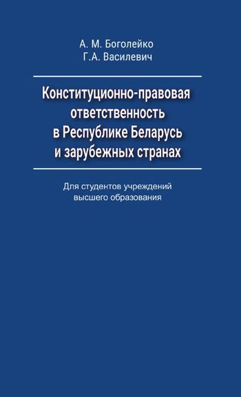 Боголейко, А. М. Конституционно-правовая ответственность в Республике Беларусь и зарубежных странах : учебное пособие / А. М. Боголейко, Г. А. Василевич. — Минск : Вышэйшая школа, 2016. — 288 c. — ISBN 978-985-06-2712-4. — Текст : электронный // Цифровой образовательный ресурс IPR SMART : [сайт]. — URL: https://www.iprbookshop.ru/90779.html (дата обращения: 25.07.2023). — Режим доступа: для авторизир. пользователей