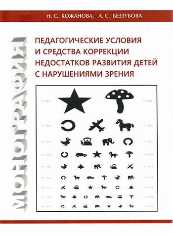 Кожанова, Н. С. Педагогические условия и средства коррекции недостатков развития детей с нарушениями зрения : монография / Н. С. Кожанова, А. С. Беззубова. — Сургут : Сургутский государственный педагогический университет, 2019. — 174 c. — ISBN 978-5-93190-384-2. — Текст : электронный // Цифровой образовательный ресурс IPR SMART : [сайт]. — URL: https://www.iprbookshop.ru/94286.html (дата обращения: 17.10.2024). — Режим доступа: для авторизир. пользователей