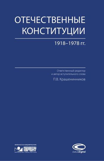 Отечественные конституции 1918–1978 гг. / составители П. В. Крашенинников, О. А. Рузакова, под редакцией П. В. Крашенинникова. — Москва : Статут, 2018. — 719 c. — ISBN 978-5-907139-21-3. — Текст : электронный // Цифровой образовательный ресурс IPR SMART : [сайт]. — URL: https://www.iprbookshop.ru/94616.html (дата обращения: 28.10.2024). — Режим доступа: для авторизир. пользователей