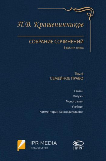 Крашенинников, П. В. Собрание сочинений. В 10 томах. Т.6. Семейное право / П. В. Крашенинников. — Москва : Статут, 2019. — 338 c. — ISBN 978-5-8354-1559-5 (т.6), 978-5-8354-1488-8. — Текст : электронный // Цифровой образовательный ресурс IPR SMART : [сайт]. — URL: https://www.iprbookshop.ru/94624.html (дата обращения: 02.08.2024). — Режим доступа: для авторизир. пользователей